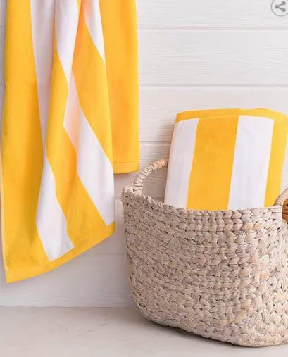 Introducing the CABANA POOL TOWELS featuring a stylish White x Yellow Stripe design. These towels are generously sized at 35 x 70 inches and weigh 20.00 lb per dozen, providing luxurious comfort and absorbency. Crafted from 100% 2 Ply Ringspun Cotton Yarn with Vat Dyed 2x2 Cabana construction, they offer exceptional softness and durability. The towels are elegantly finished with a dobby edge and are machine washable for easy maintenance. Packaged conveniently in a set of 1 dozen, they are perfect for enhancing your poolside experience or beach outings.